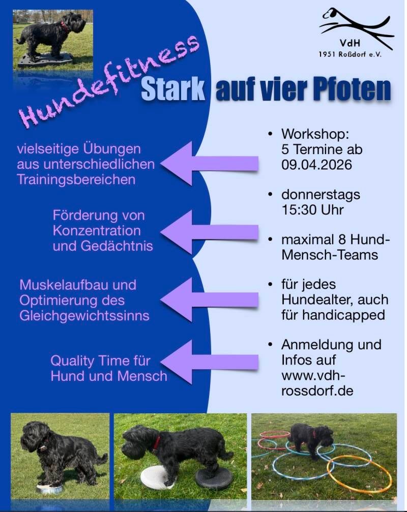 Ab dem 09.04.2026 findet auf unserem Vereinsgelände ein Workshop zum Thema Hundefitness statt. Weitere Infos findet ihr wie immer unter Aktuelles.